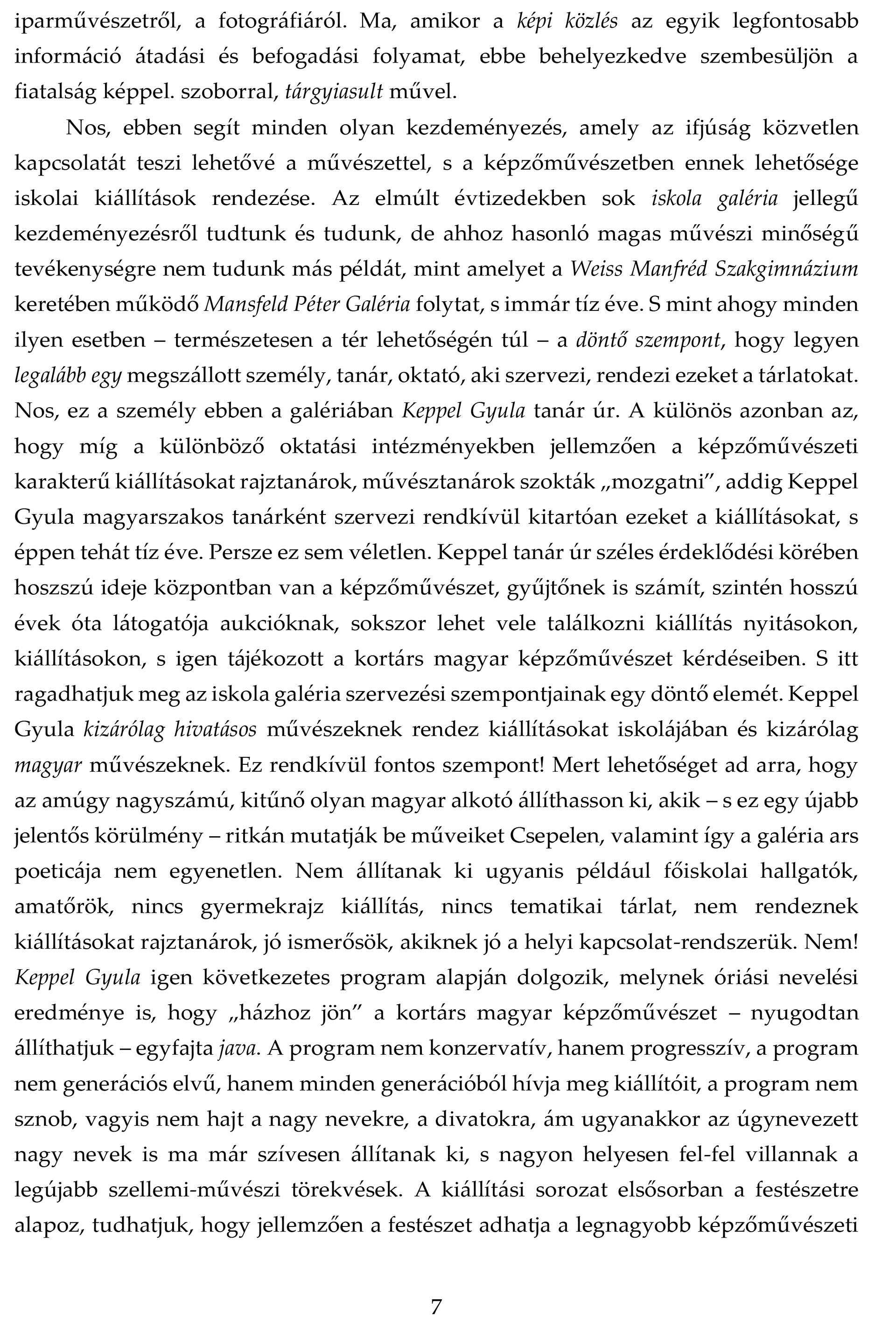A Mansfeld Péter Kortárs Képzőművészeti Galériát 2008-ban Keppel Gyula középiskolai magyartanár alapította és a mai napig művészeti vezetője, a kiállítások szervezője, rendezője.