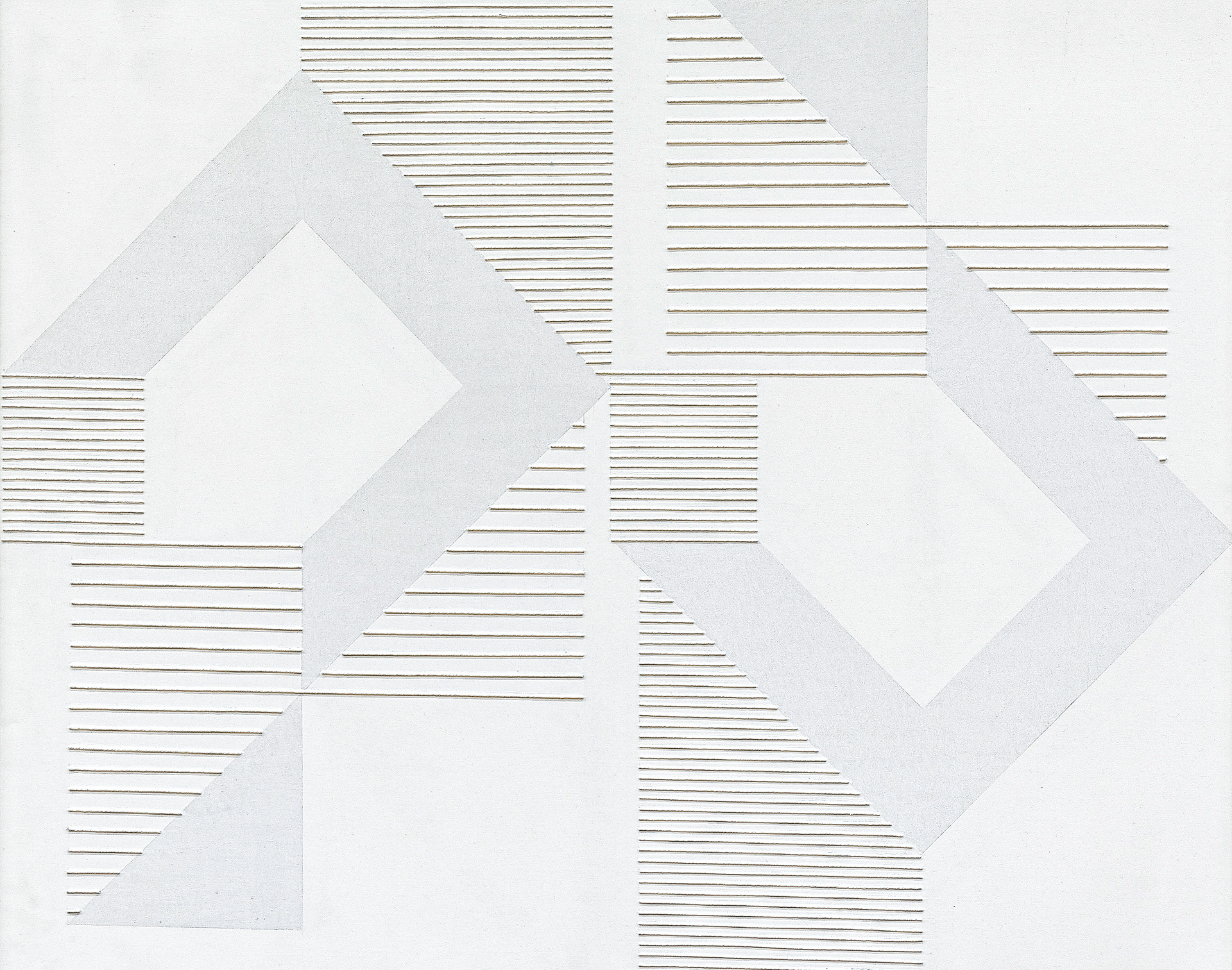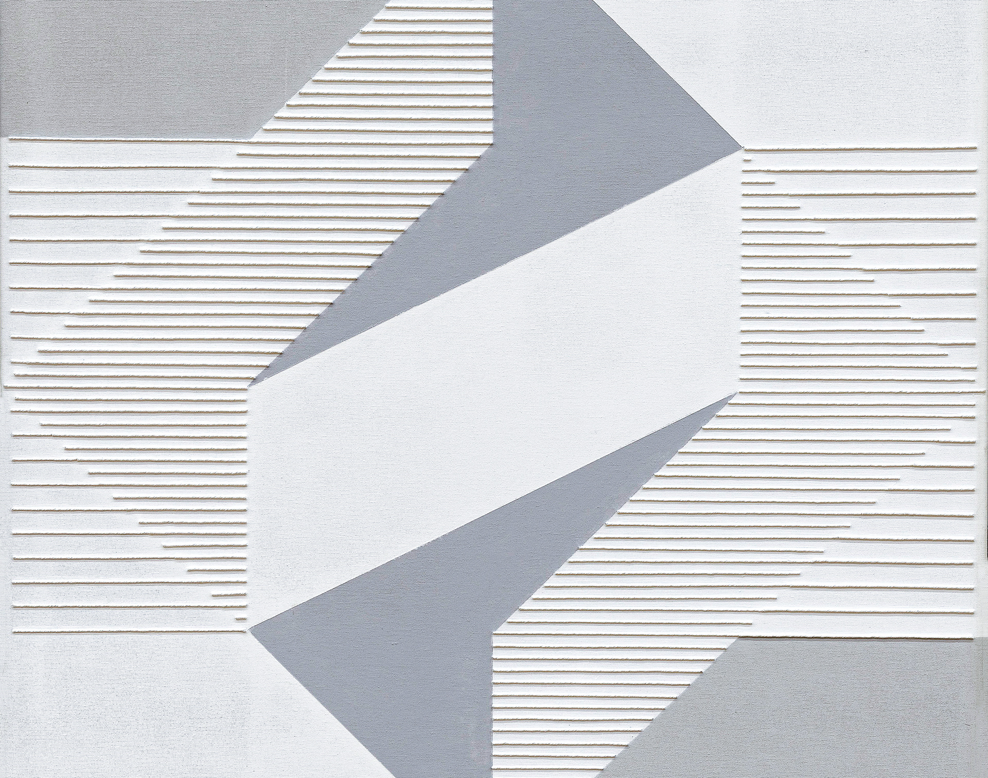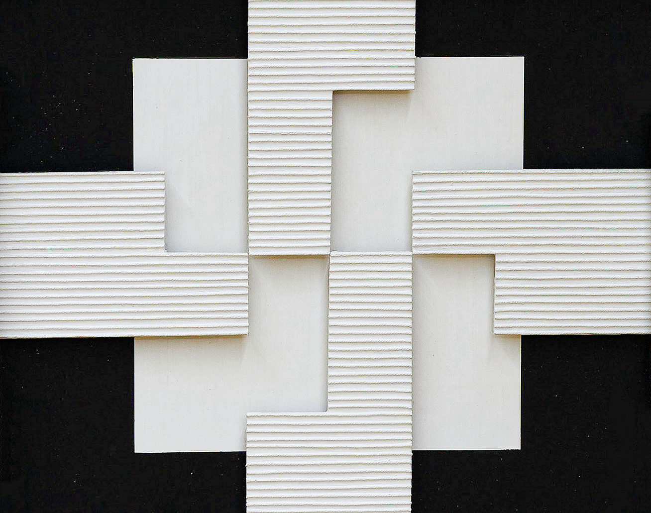 A fehér alapra mindig horizontálisan helyezem el a különböző vastagságú pamutfonalakból álló kompozíciót, melyek térbeli perspektivikus és plasztikus (relief) hatást keltenek. A kialakított kompozíciók hangsúlyosabbá tételét egy vagy két, különböző szürke tónussal egészítettem ki. Az elkészült munkáim az általam kívánt megfelelő formai és szellemi tisztaságot viselik, a kompozícióban elhelyezett formák – térgeometriát – képviselnek. A belső törvények alapján létrehozott geometrikus formák alá vagy fölérendeltséget, feszültséget vagy nyugalmat hordoznak. A formák variációs lehetőségei számomra új gondolatokat teremtve, számos kompozíció létrehozását biztosítják.”