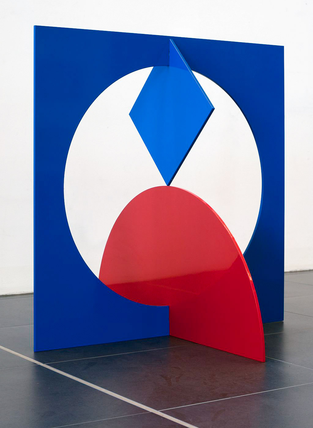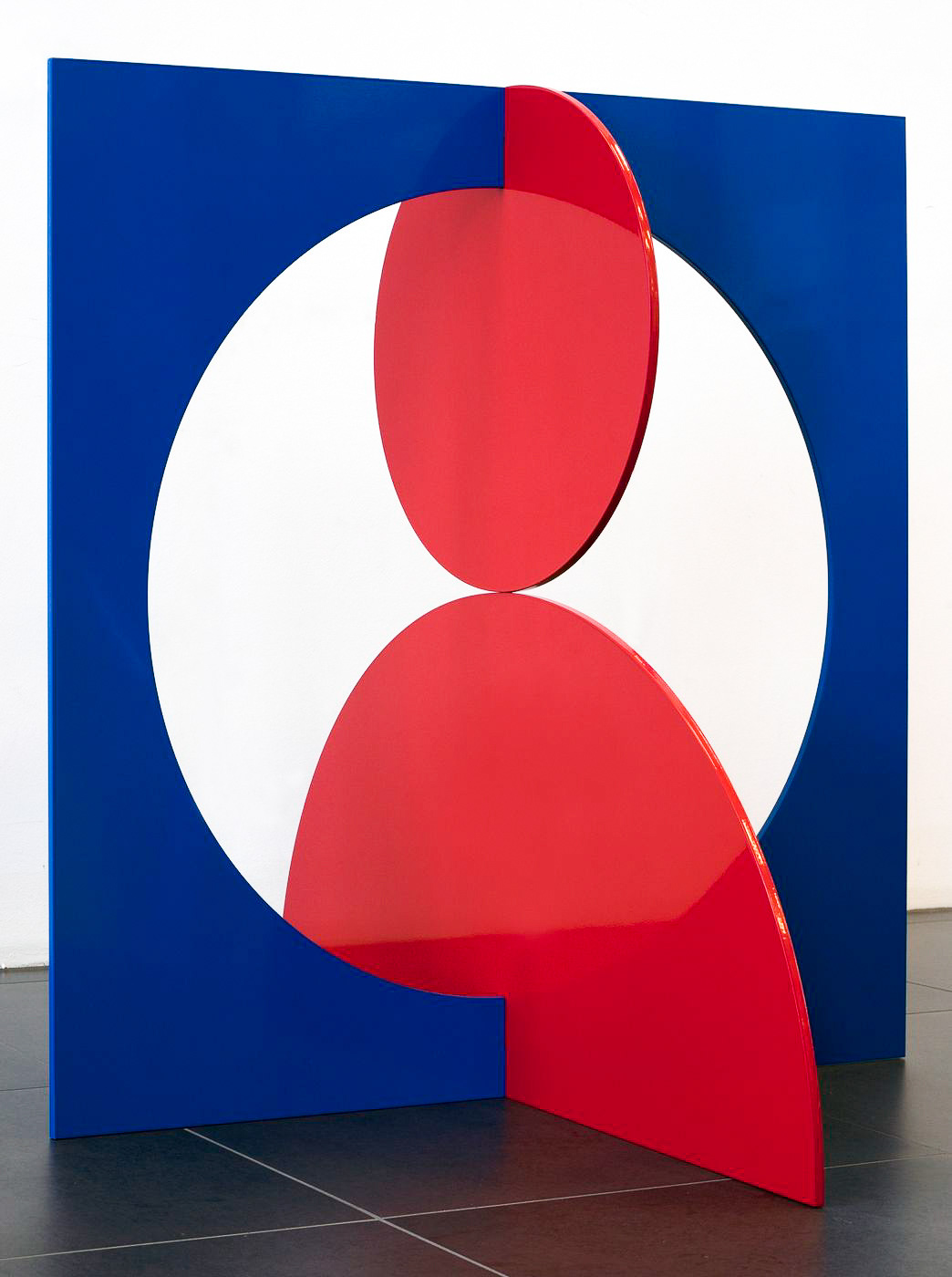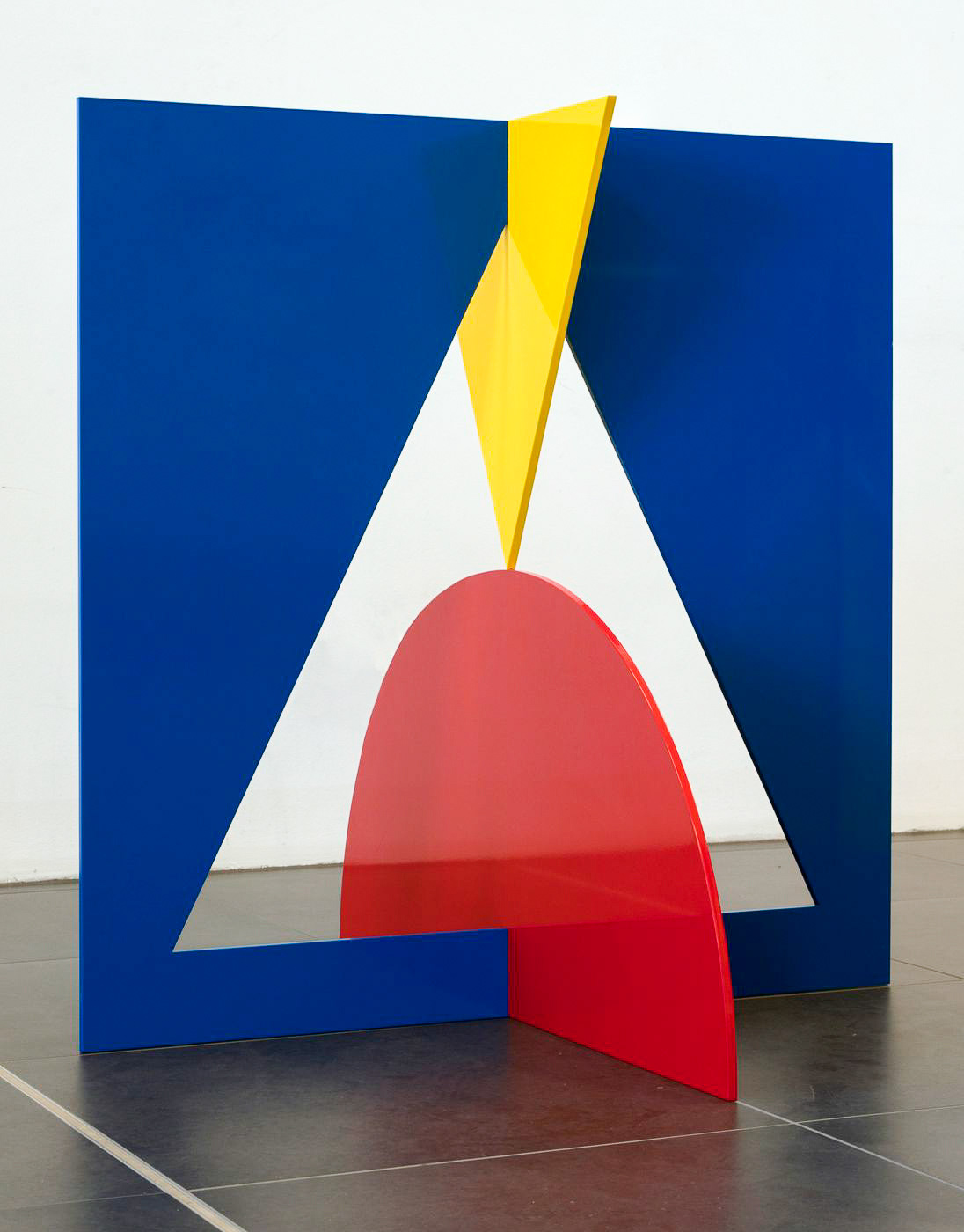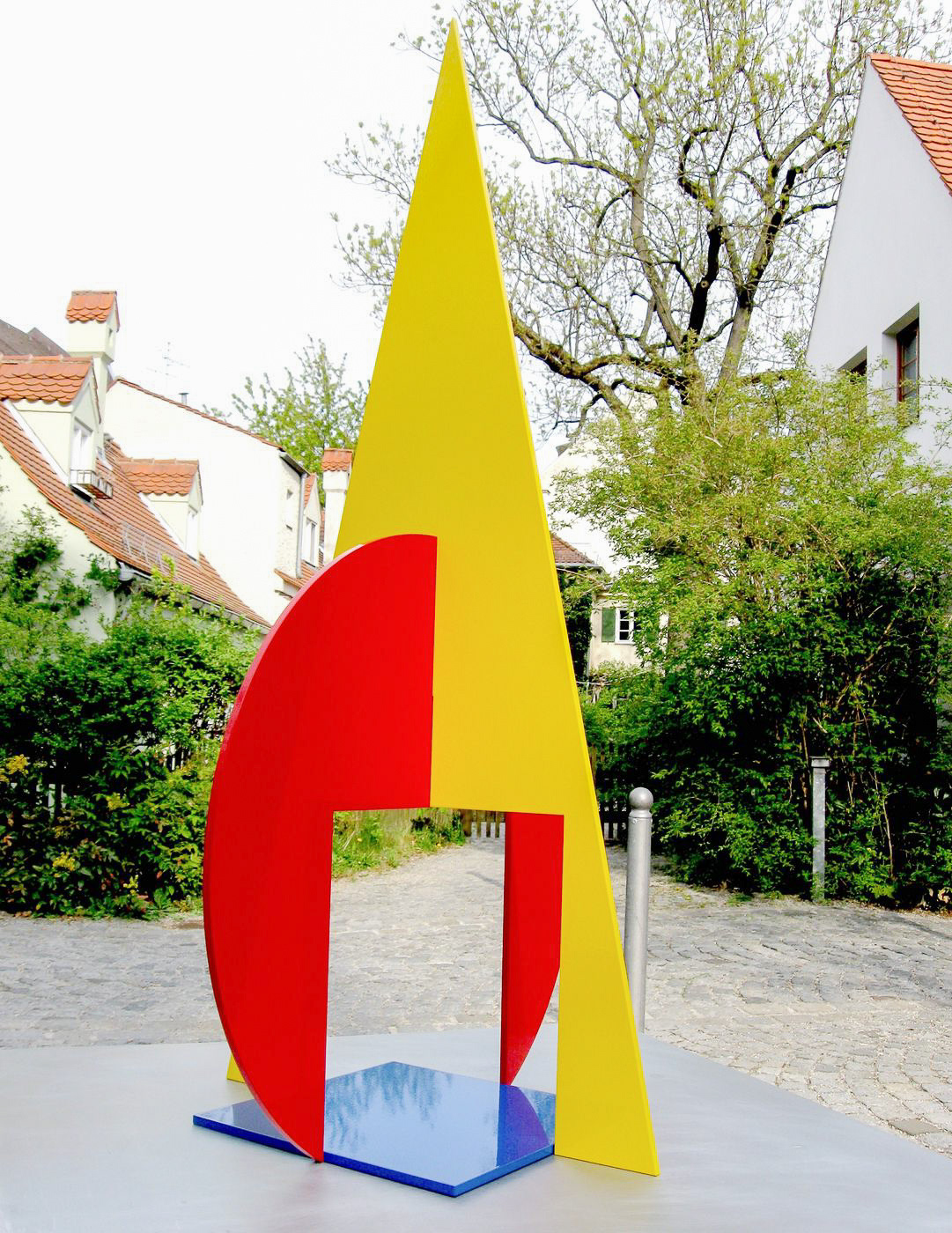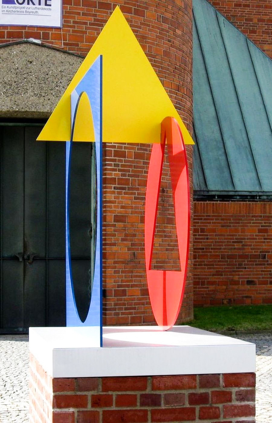 „Miért forog a vörös? miért agresszív a sárga? s végül – miért nyugodt a kék? Leginkább azért, mert a művész, Ingo Glass így akarja. Vagy talán azért, hogy ellentmondjon, túllépjen a Bauhaus mestereken, Johannes Ittenen és Vaszilij Kandinszkijen, akik az ugyanezeket az alapformákat – kör, négyzet, háromszög – és ugyanezeket az alapszíneket – vörös, sárga, kék – más értelemben párosítják össze (a négyzethez vöröset, a háromszöghöz sárgát, a körhöz kéket rendelnek). Kinek van igaza, és miért? Elméletileg nehéz erre felelni – noha mind Itten, mind Kandinszkij színtana alaposan kidolgozott, eldolgozott, de főleg festményekre, azaz síkokra vonatkozik, és nem annyira szoborra vagy térre. Azaz térbeli plasztikára. Mert Ingo Glassnak több évtizede ez az igazi műfaja. Ingo Glass a gyakorlatban valósította meg a színek és a formák összefüggésének rendszerét, számos olyan műben, amely egyszerre szín és forma. A forma síkokból, többnyire acéllemezekből áll ösze. A lemezek vagy csak síkban léteznek, s így leginkább sziluettjükkel hatnak, vagy – ami gyakoribb – a síkok egymáson áthatolnak, keresztezik egymást, egyik sík átvágja, felhasítja a másikat, míg a másik nyugodtan terpeszkedik a maga kiegyensúlyozott nyugalmával a talajon, talapzaton. Mindez a térben történik, szerencsés esetben a szabad természetben, ahol a formák akár 15 méteres magasságra is nőhetnek…”