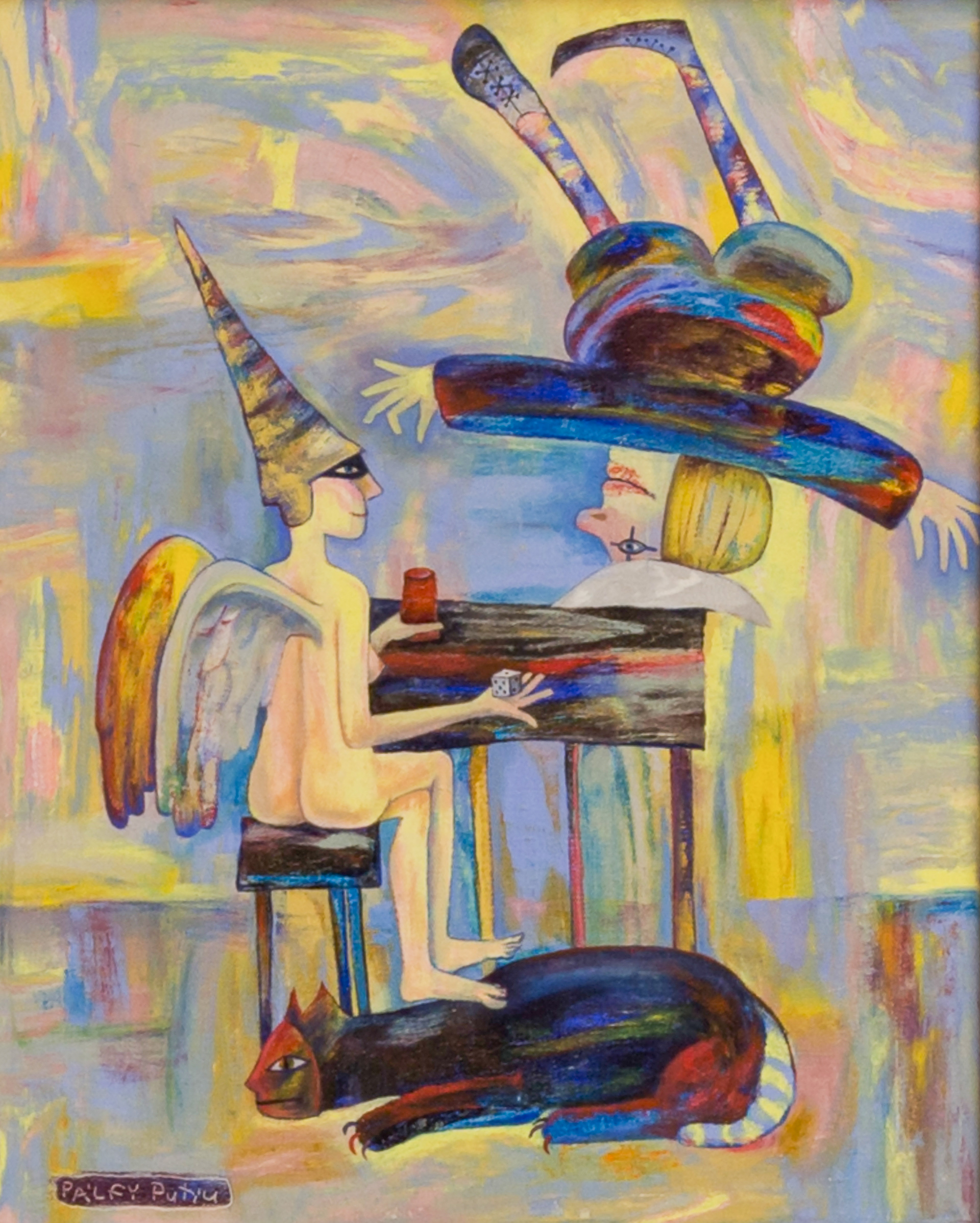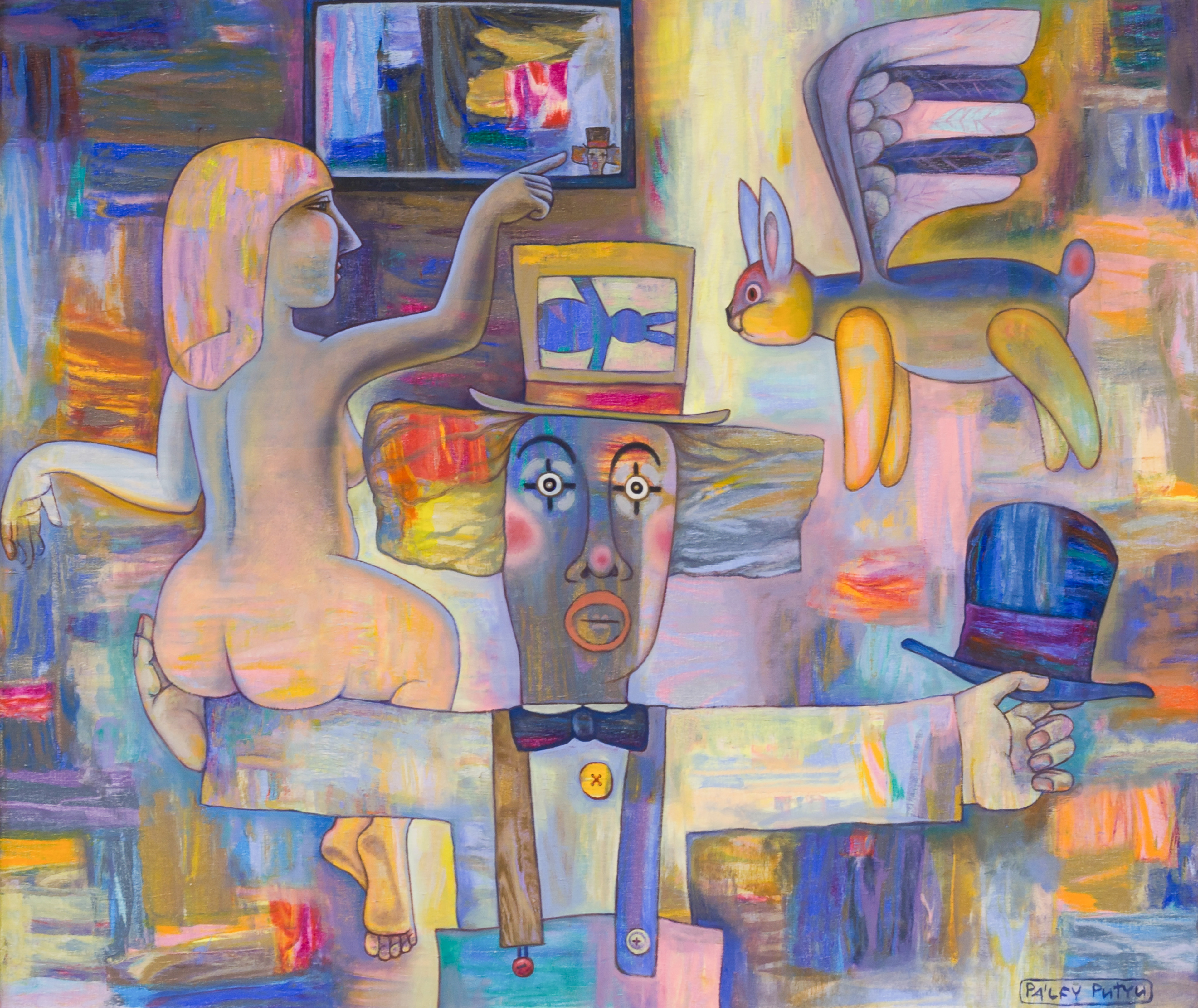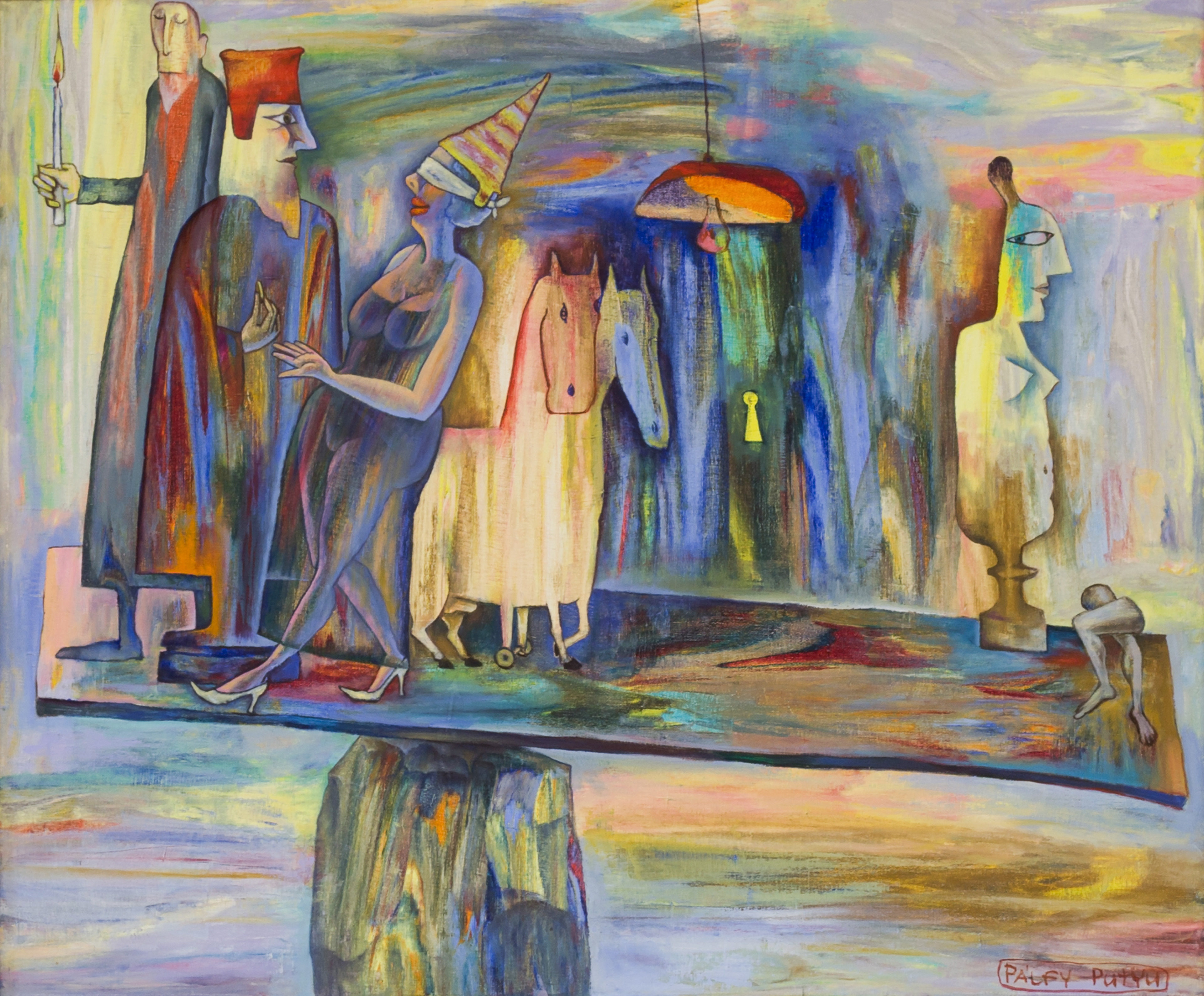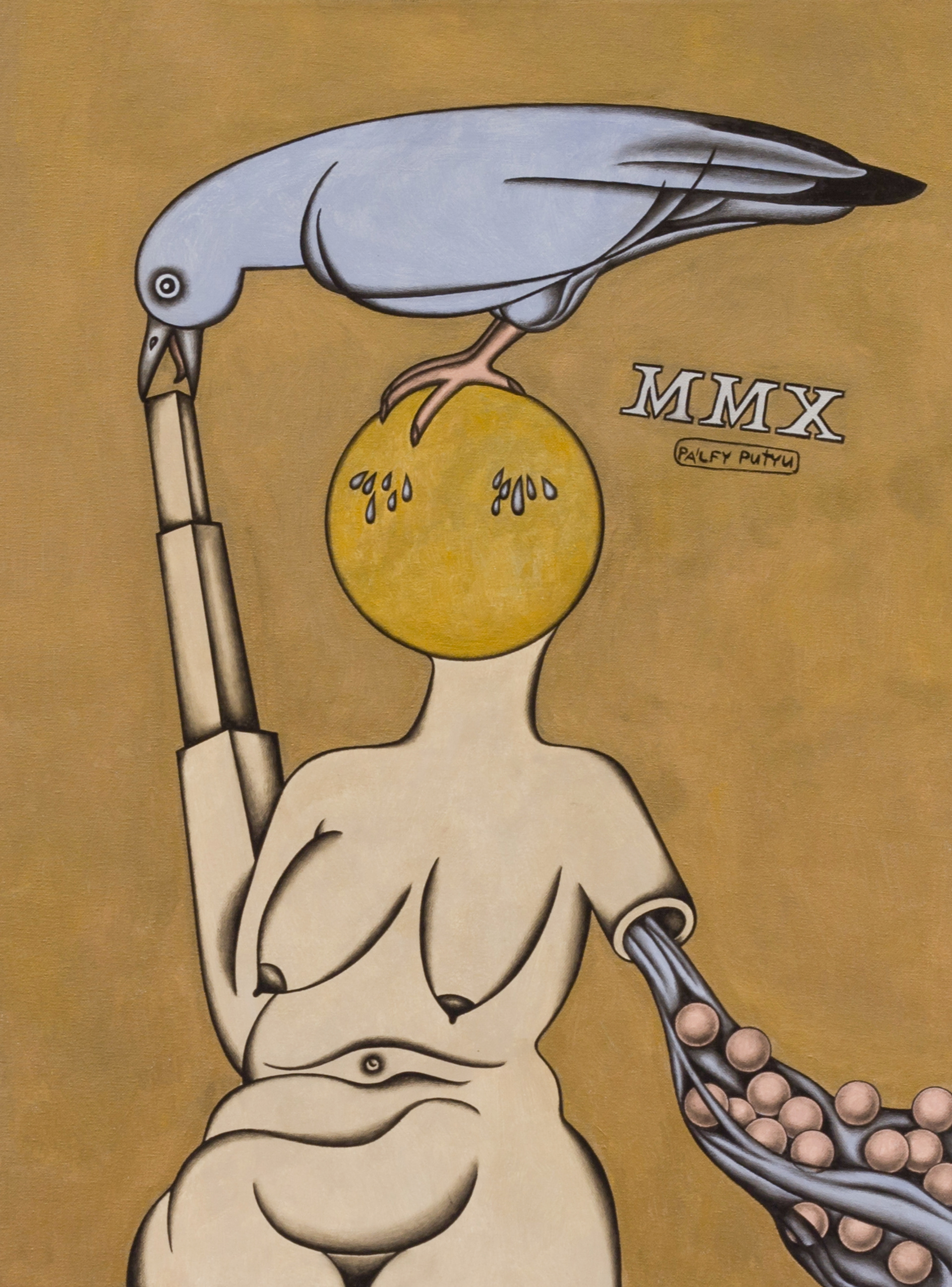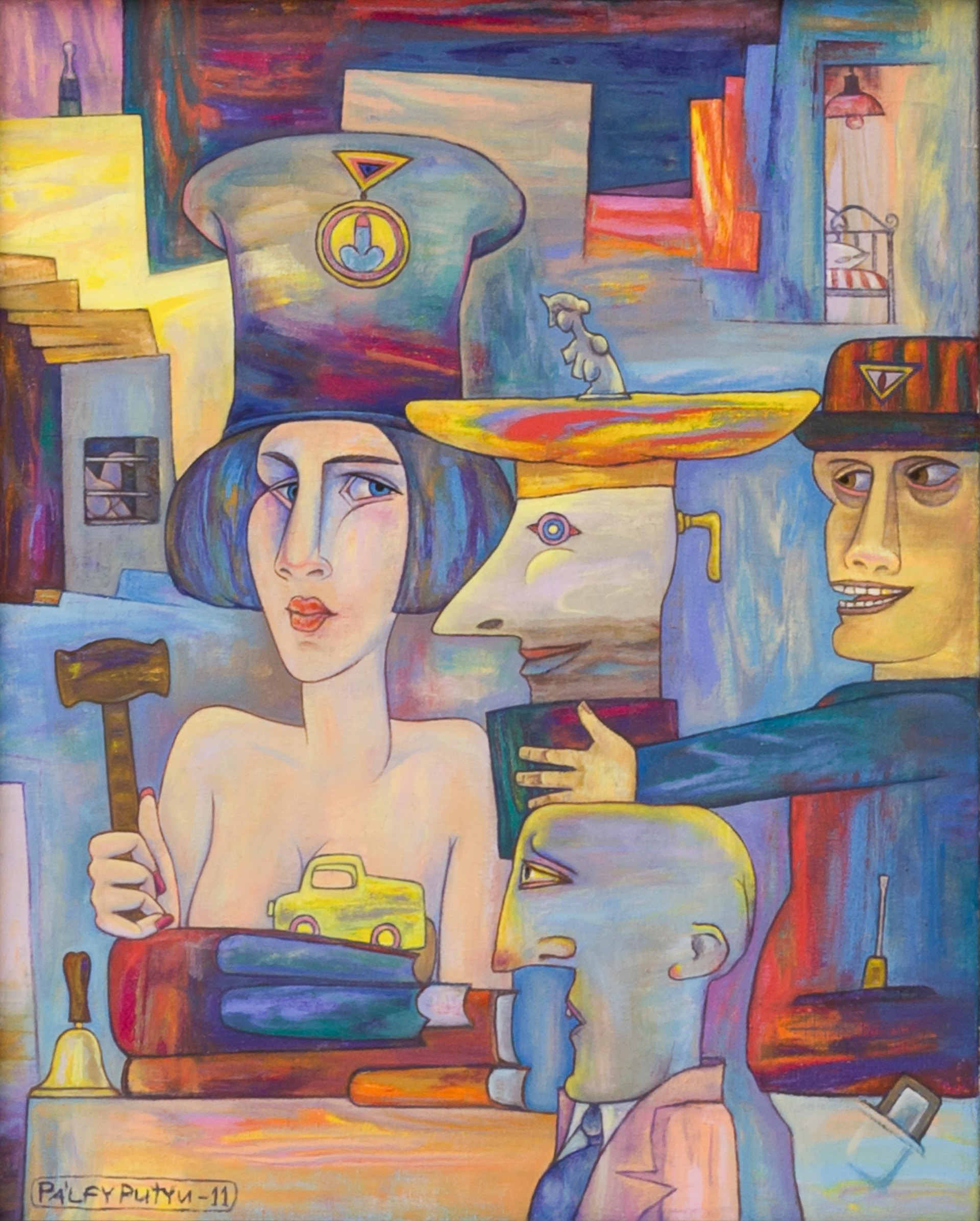 „Pálfy Putyu autonóm és sokoldalú alkotó. Jóllehet, készít szobrokat, grafikákat, kerámiákat is, sok kortárs alkotóval ellentétben alázata megmaradt a táblakép iránt. Nem egyszerűen szürrealista vagy posztmodern alkotó, saját mitikus világát egyedileg kialakított festési metódusokkal tárja elénk. sok munkája expresszív absztrakt képekből indul, a spaklival szinte véletlenszerűen felhordott színösszhangzatokból később alakul ki a figurális anyag. Putyu szimbólumrendszere könnyen átélhető. Hősei zenészek, bohócok, művészek, csavargók, de legtöbbször fura félszerzetek, marionettfigura-szerű, a tehetetlenségtől elcsökevényesedett testű, vagy épp szükségszerűségből, önmagukból hangszereket, szerszámokat növesztett lények. Pálfy szarkasztikus humora megkönnyíti a szembenézést önmagunk kitekert világával. Képeit ugyanakkor úgy is olvashatjuk, mint történeteket.