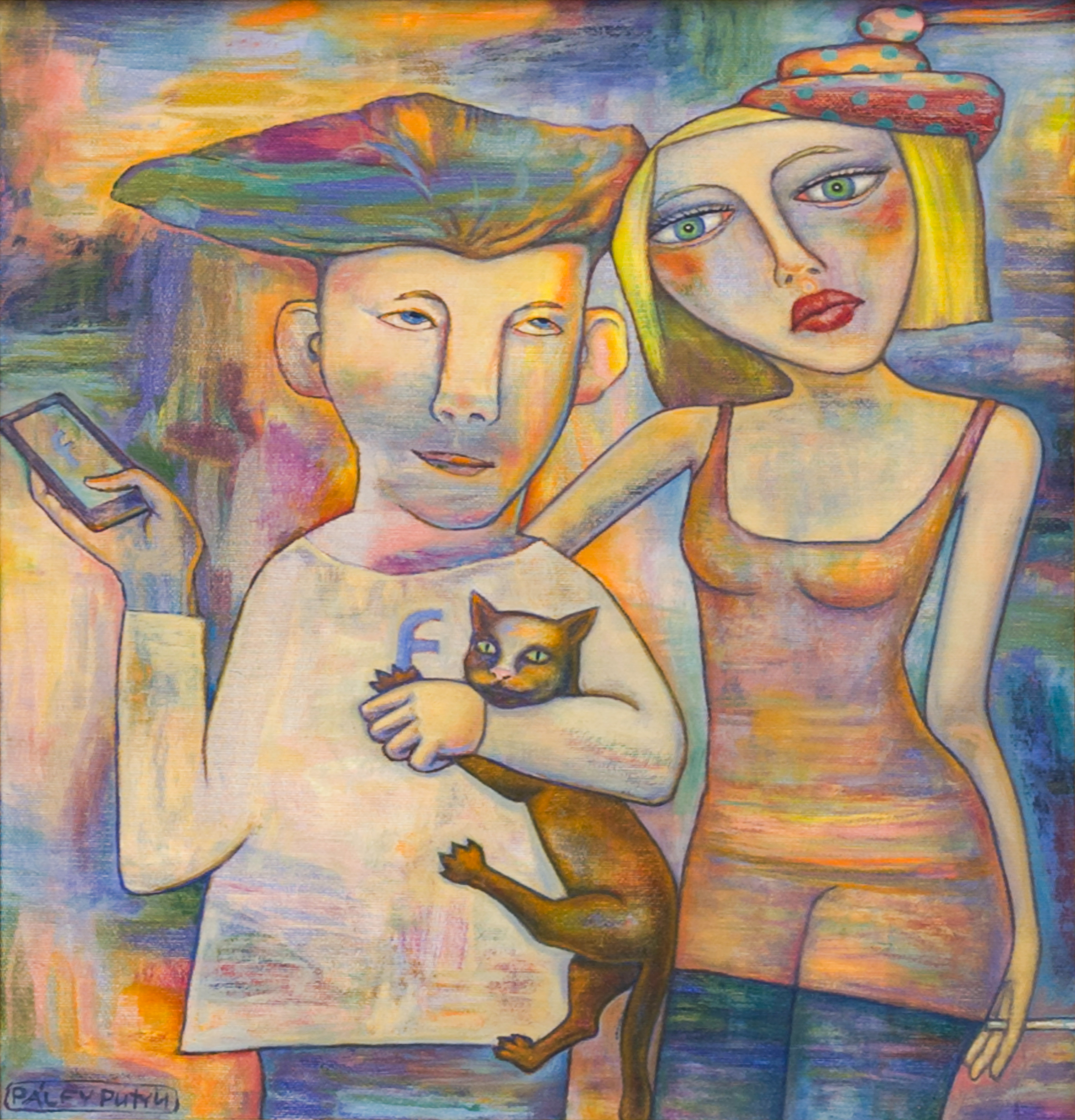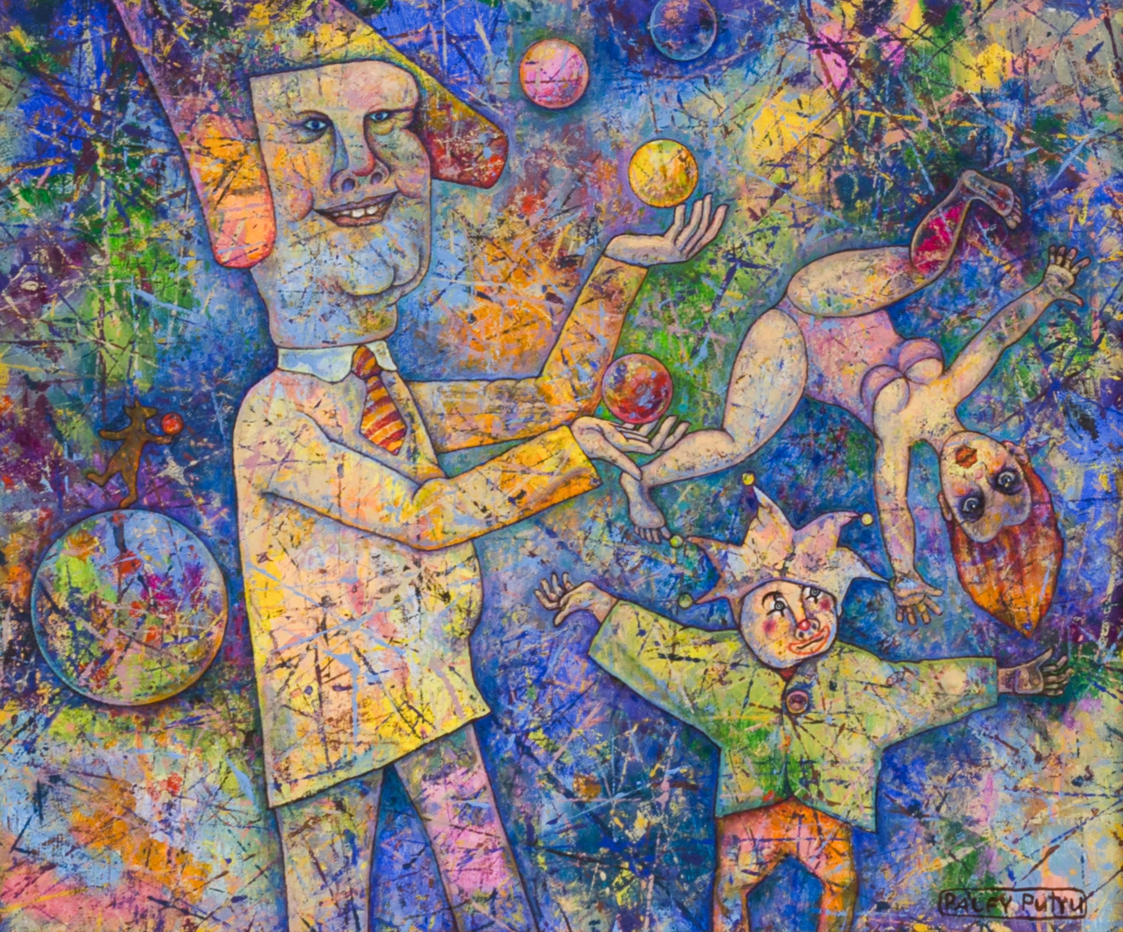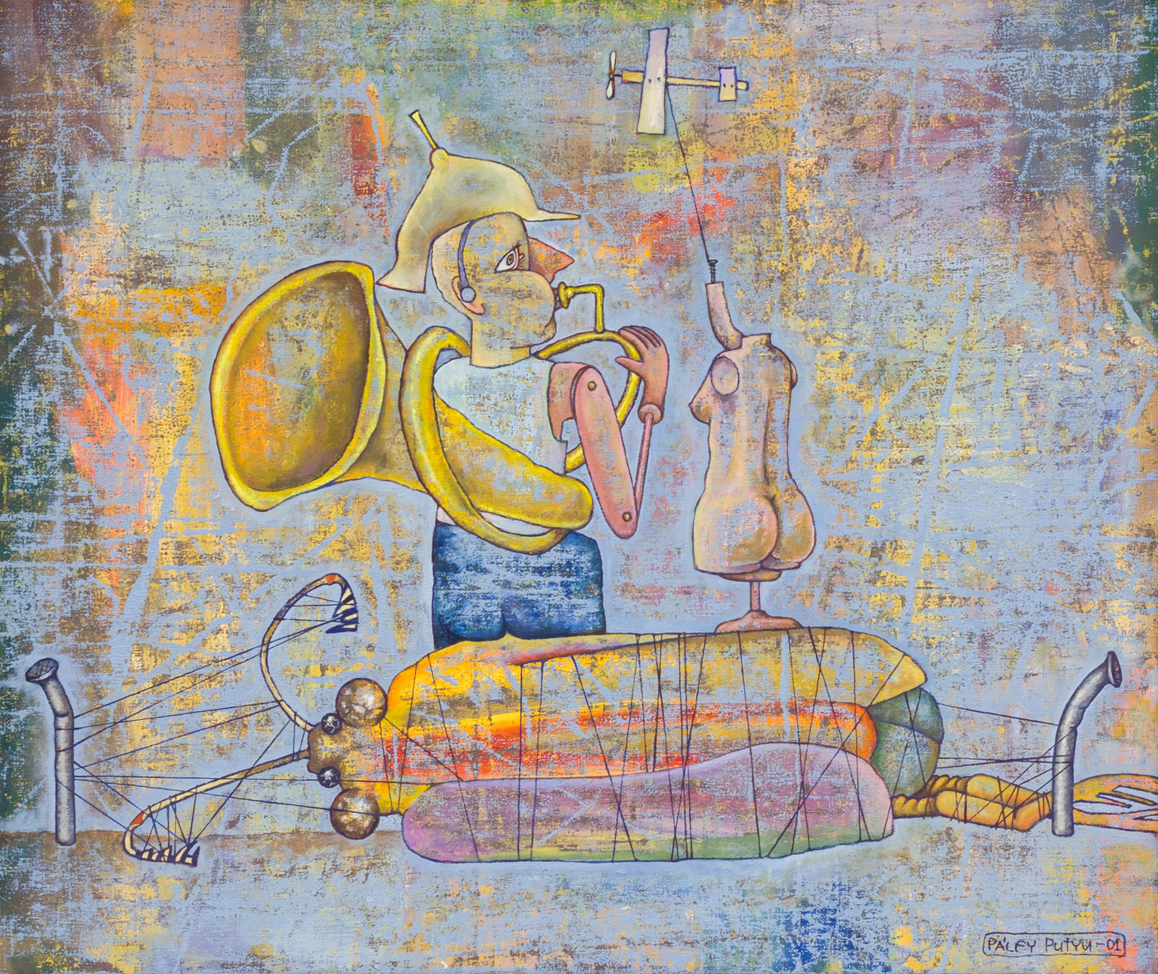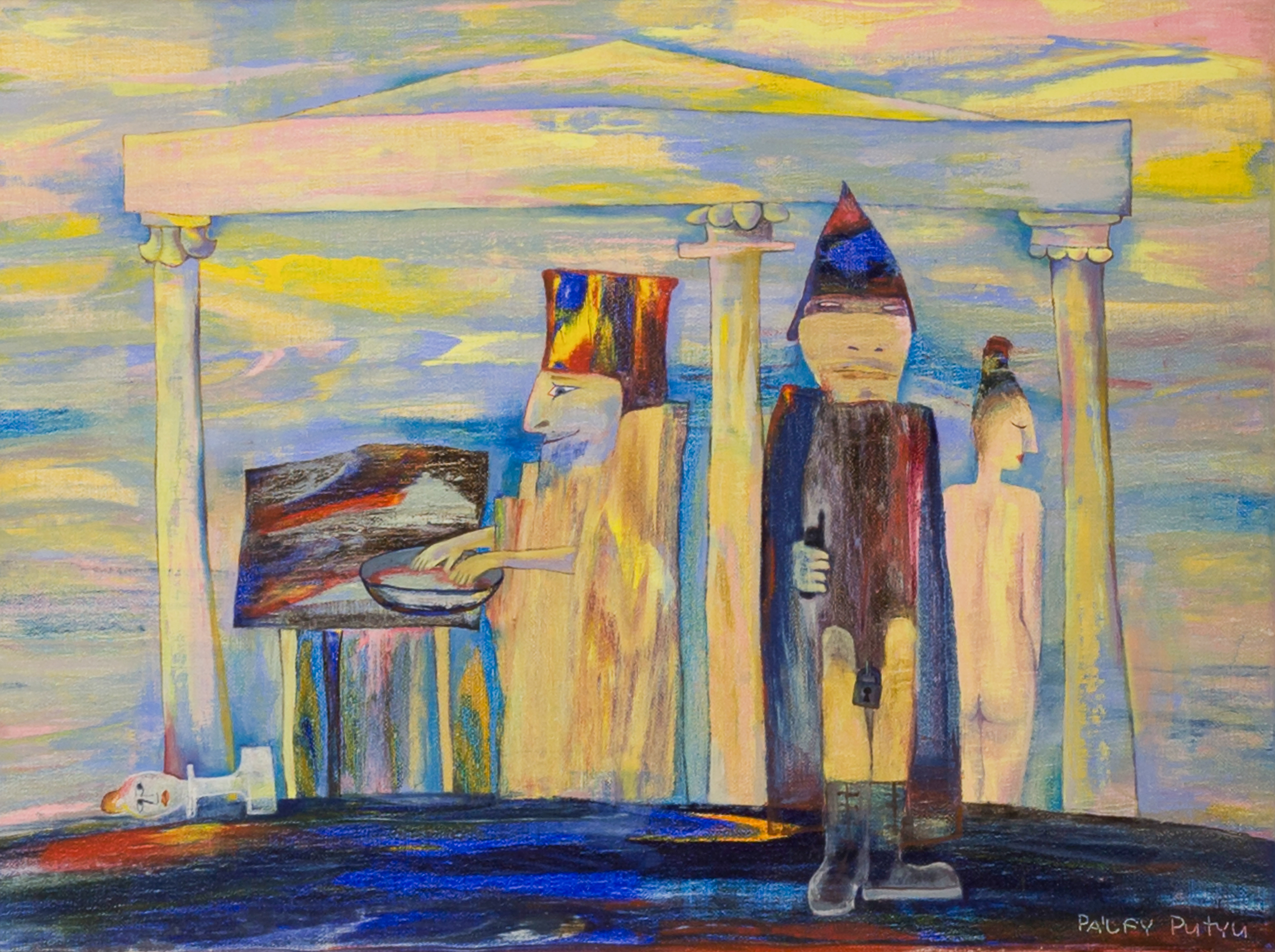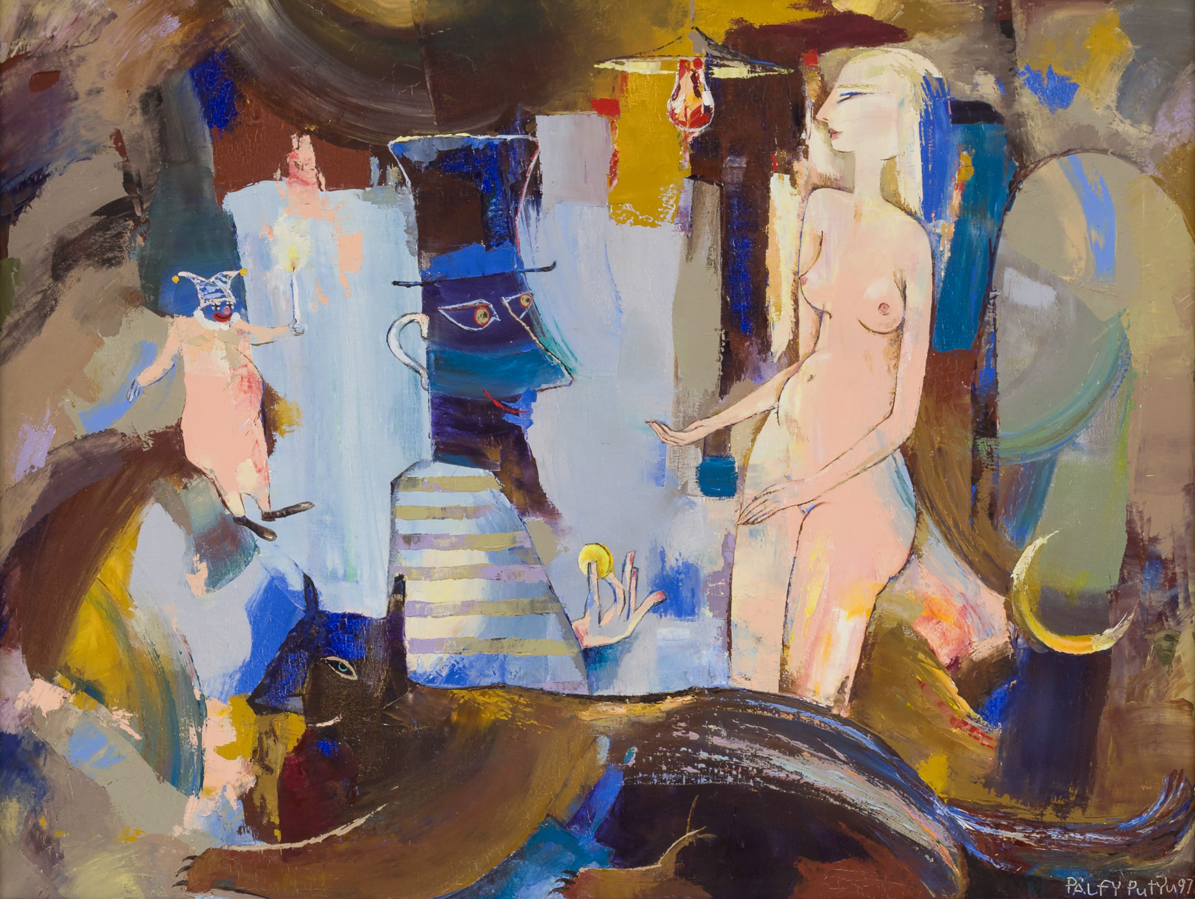 „Pálfy Putyu autonóm és sokoldalú alkotó. Jóllehet, készít szobrokat, grafikákat, kerámiákat is, sok kortárs alkotóval ellentétben alázata megmaradt a táblakép iránt. Nem egyszerűen szürrealista vagy posztmodern alkotó, saját mitikus világát egyedileg kialakított festési metódusokkal tárja elénk. sok munkája expresszív absztrakt képekből indul, a spaklival szinte véletlenszerűen felhordott színösszhangzatokból később alakul ki a figurális anyag. Putyu szimbólumrendszere könnyen átélhető. Hősei zenészek, bohócok, művészek, csavargók, de legtöbbször fura félszerzetek, marionettfigura-szerű, a tehetetlenségtől elcsökevényesedett testű, vagy épp szükségszerűségből, önmagukból hangszereket, szerszámokat növesztett lények. Pálfy szarkasztikus humora megkönnyíti a szembenézést önmagunk kitekert világával. Képeit ugyanakkor úgy is olvashatjuk, mint történeteket.