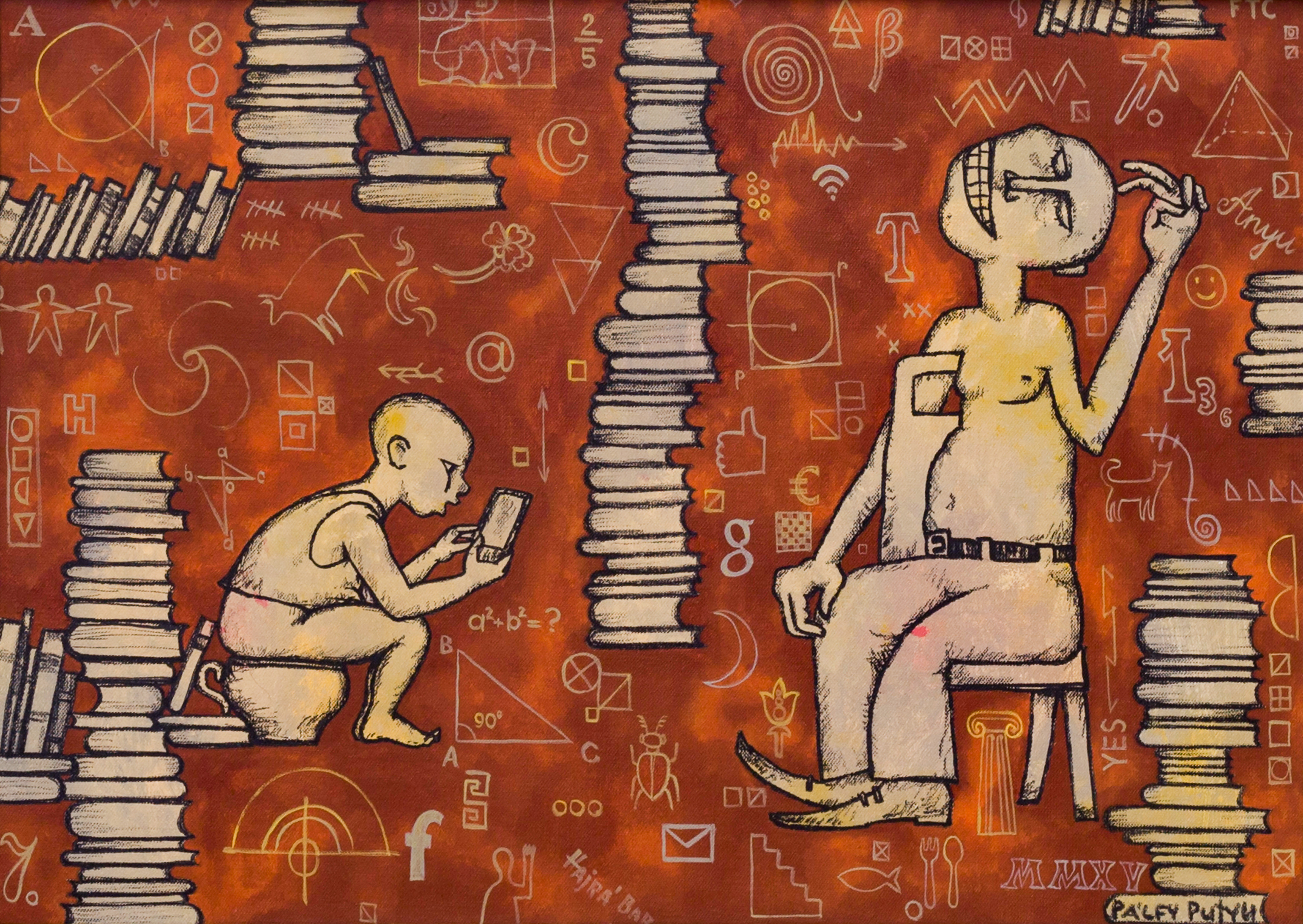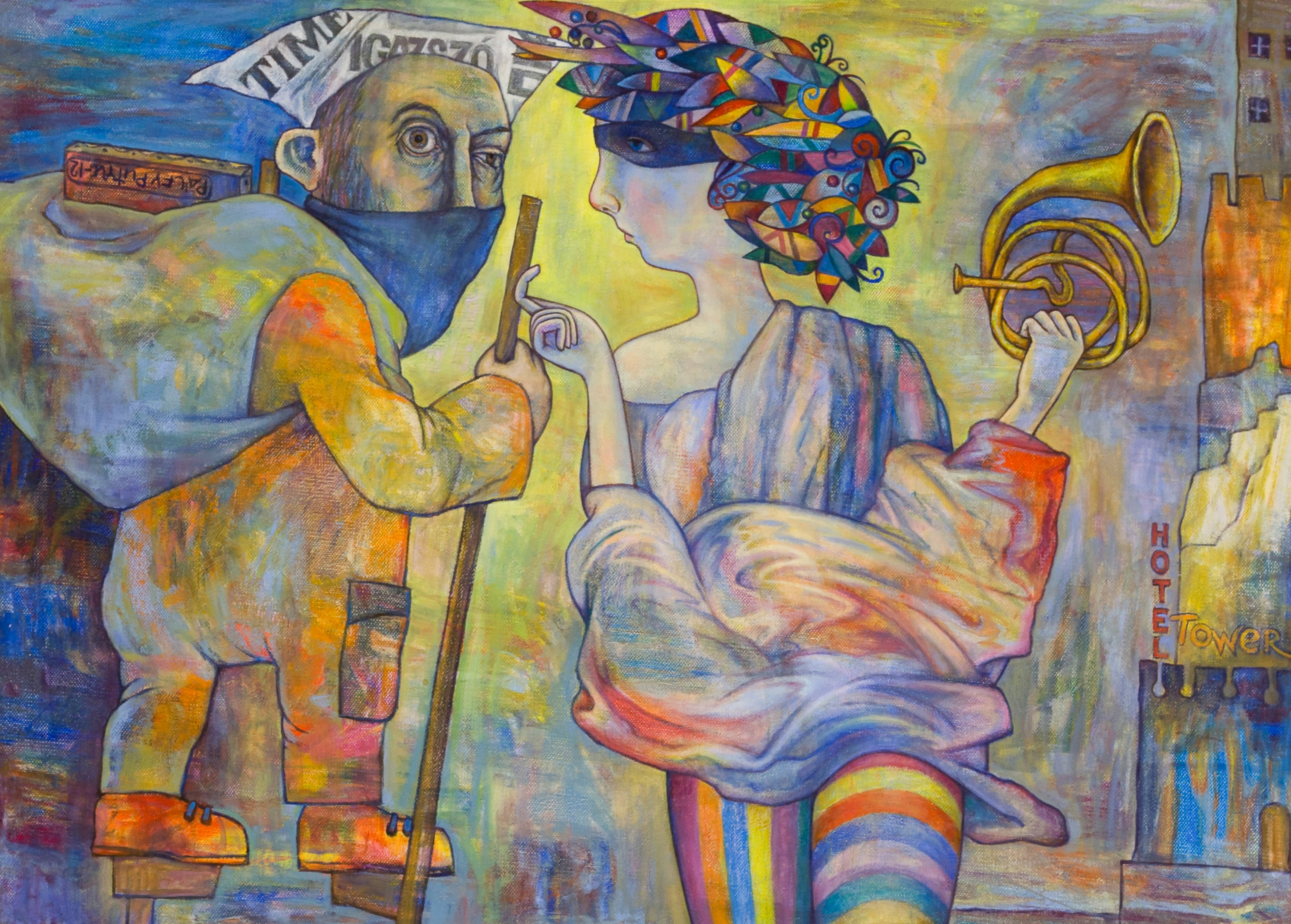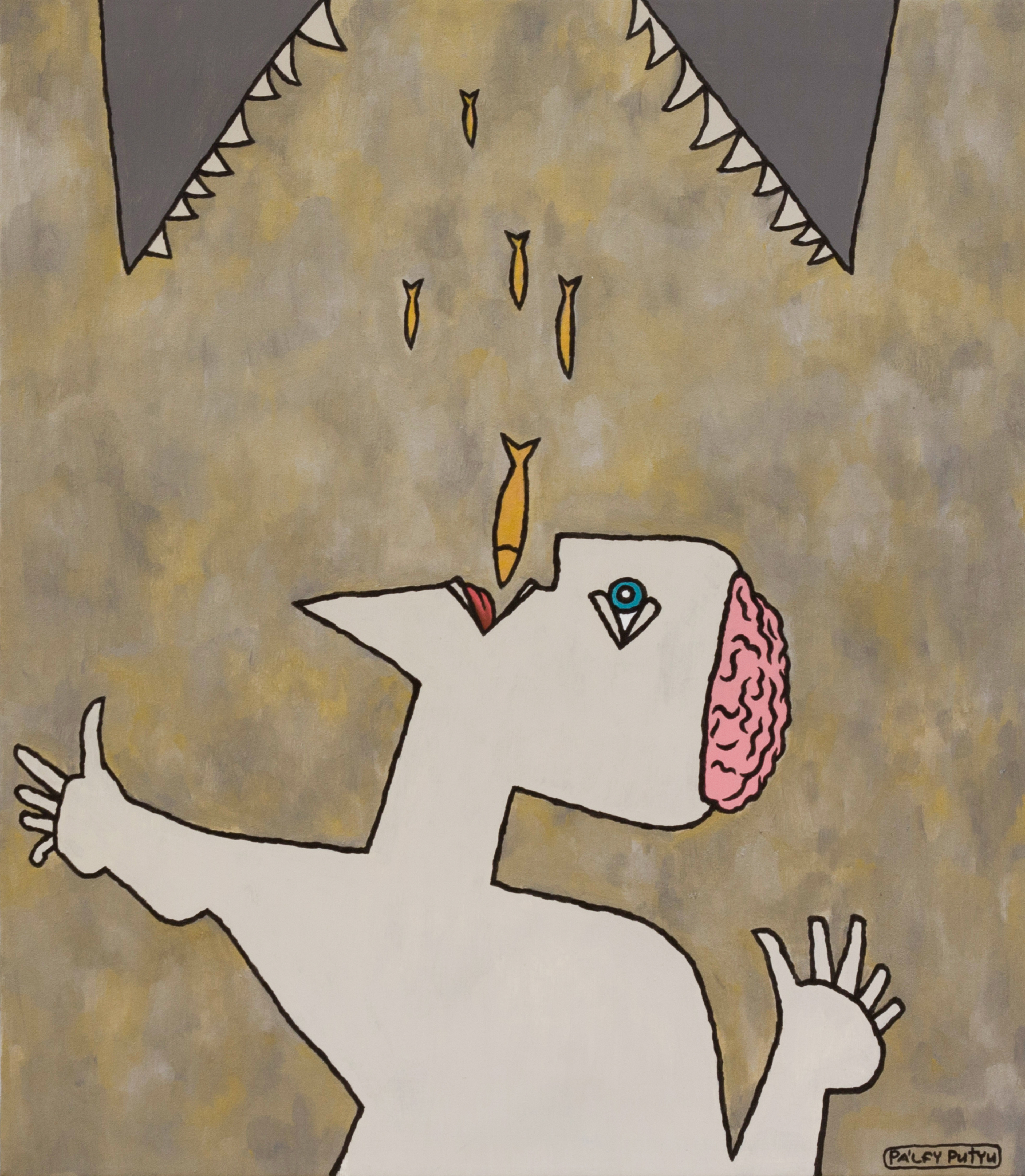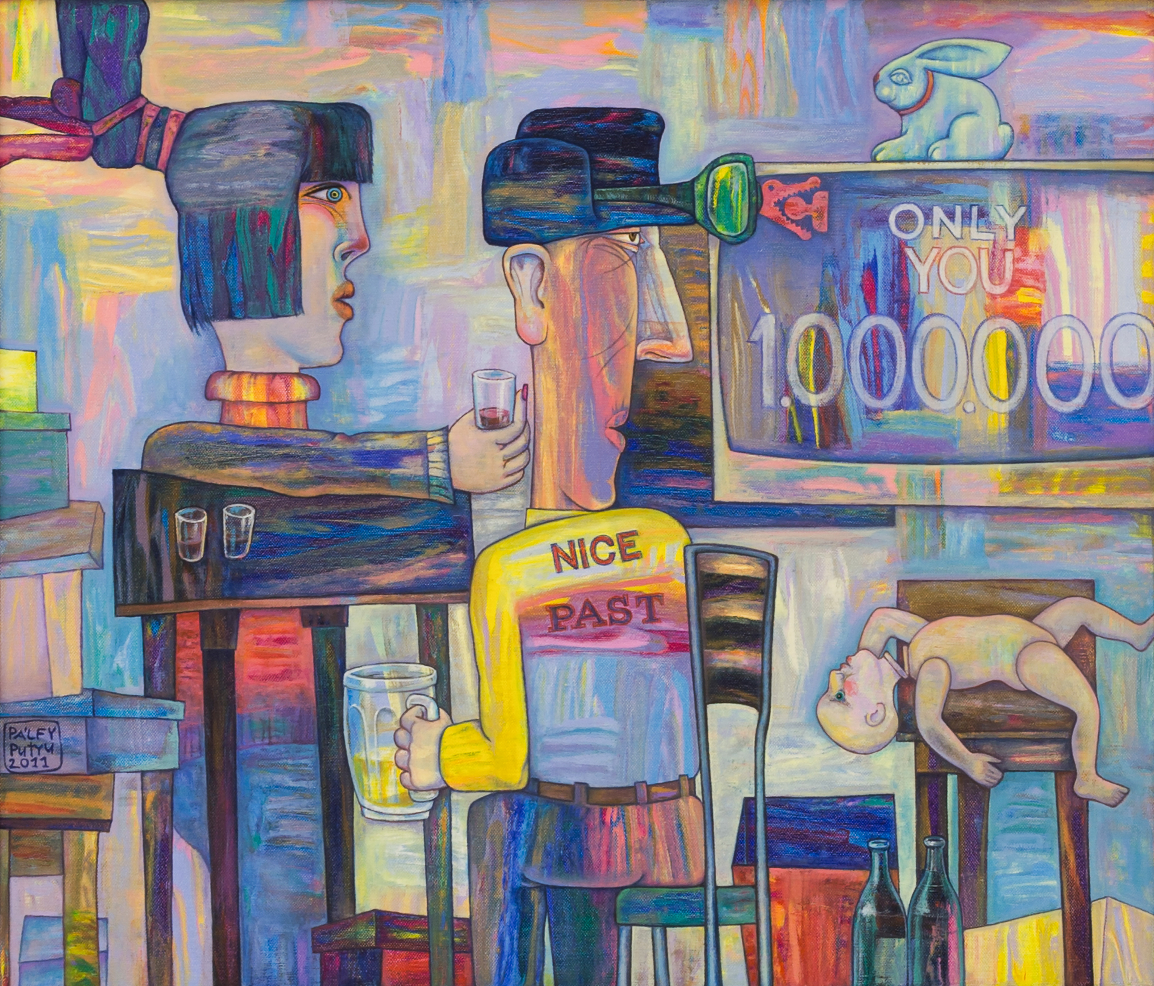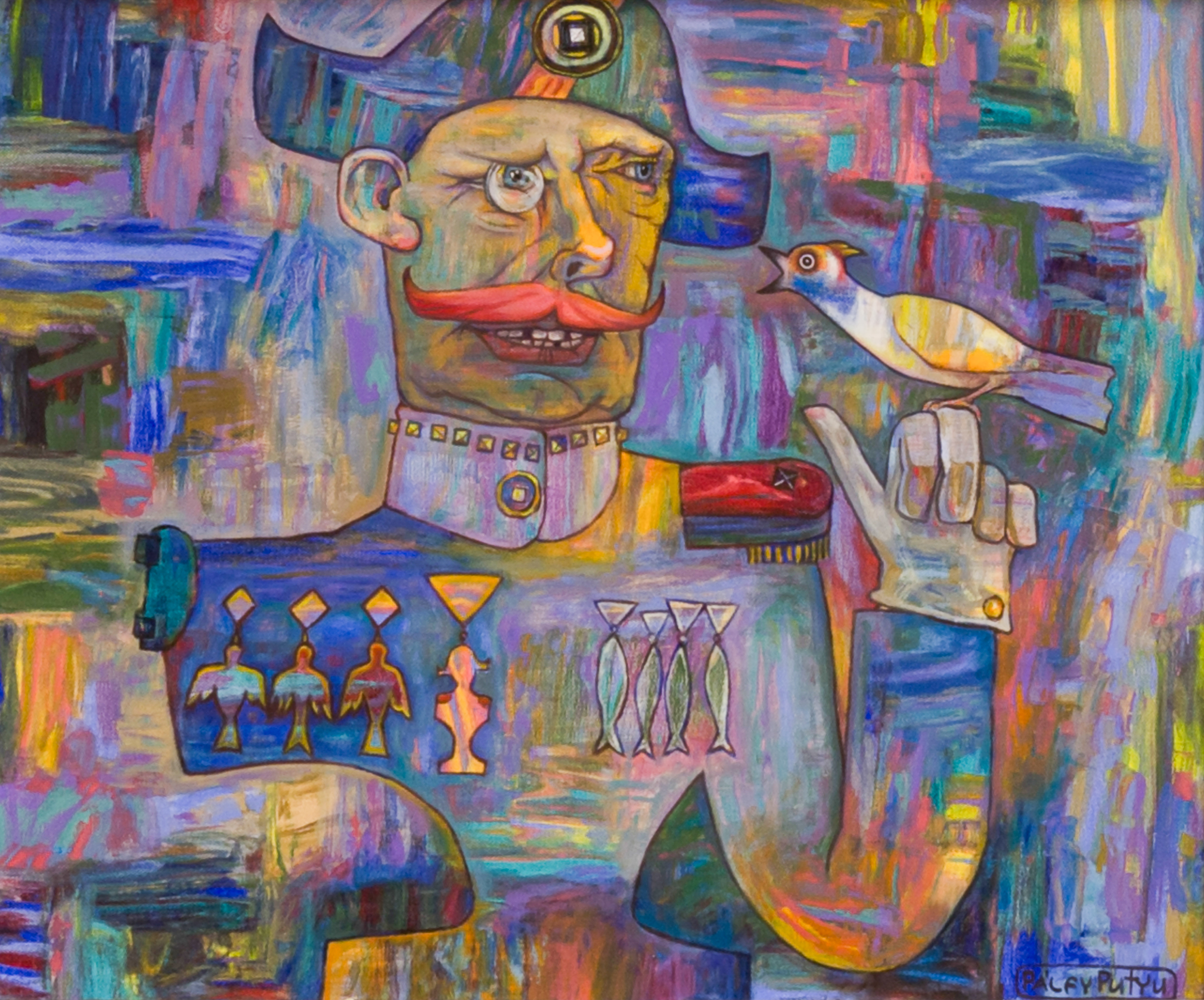 „Pálfy Putyu autonóm és sokoldalú alkotó. Jóllehet, készít szobrokat, grafikákat, kerámiákat is, sok kortárs alkotóval ellentétben alázata megmaradt a táblakép iránt. Nem egyszerűen szürrealista vagy posztmodern alkotó, saját mitikus világát egyedileg kialakított festési metódusokkal tárja elénk. sok munkája expresszív absztrakt képekből indul, a spaklival szinte véletlenszerűen felhordott színösszhangzatokból később alakul ki a figurális anyag. Putyu szimbólumrendszere könnyen átélhető. Hősei zenészek, bohócok, művészek, csavargók, de legtöbbször fura félszerzetek, marionettfigura-szerű, a tehetetlenségtől elcsökevényesedett testű, vagy épp szükségszerűségből, önmagukból hangszereket, szerszámokat növesztett lények. Pálfy szarkasztikus humora megkönnyíti a szembenézést önmagunk kitekert világával. Képeit ugyanakkor úgy is olvashatjuk, mint történeteket.